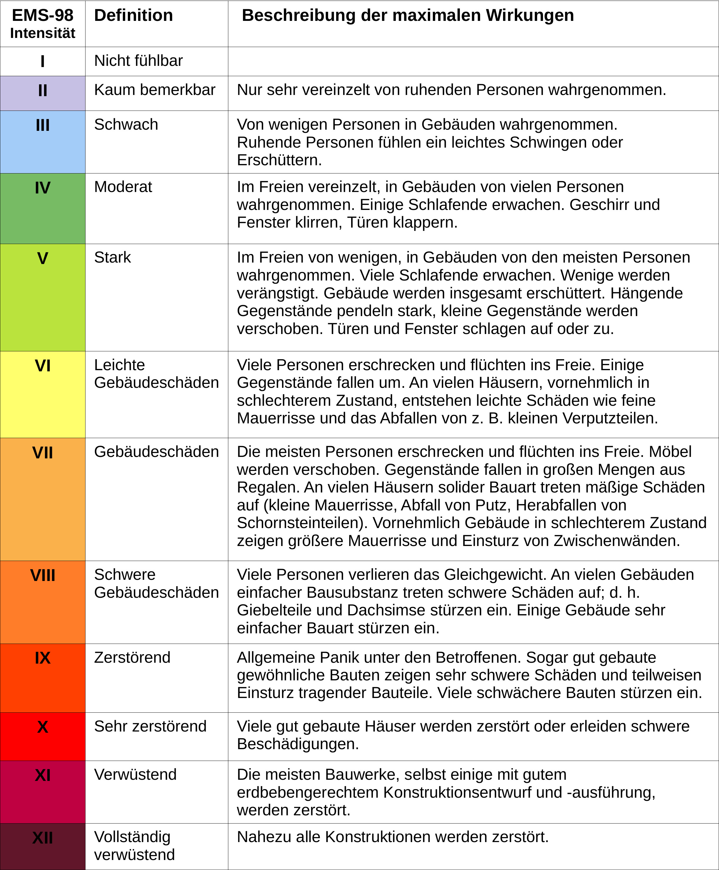 In den meisten Ländern, einschließlich Österreich, wird eine 12-stufige Intensitätsskala verwendet, die auf Mercalli-Sieberg basiert und heute als Europäische Makroseismische Skala (EMS-98) bezeichnet wird.