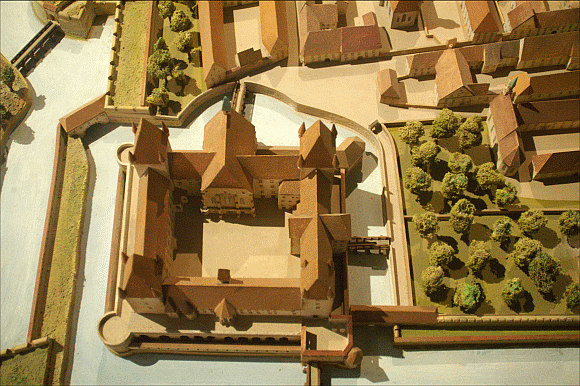 Ausschnitt (Wiener Neustädter Burg = Militärakademie) aus dem Modell von Wiener Neustadt um 1720, das vom Modellbildhauer Oskar Chmelik sehr sorgfältig nach historischen Plänen und Dokumenten aus dem Stadtarchiv hergestellt wurde. Zu sehen im Stadtmuseum von Wiener Neustadt. Nach dem Erdbeben wurde auf den Wiederaufbau der drei besonders baufälligen Ecktürme verzichtet, sodass die Burg heute nur mehr einen Turm (Rákóczi-Turm) aufweist. © GeoSphere Austria Hammerl