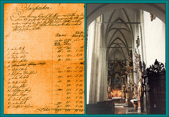Linke Abb.: Specification deren kleineren bürgerl. Partheyen Verzeichnis erlittener Schäden durch Viehseuche und Erdbeben, 1767/68, vom 1. September 1768, in: St. Arch. Wiener Neustadt, Scrin.AI, Nr.14 © GeoSphere Austria Hammerl; rechte Abb.: Nach dem Erdbeben von 1768 eingezogene Eisentraversen in der Neuklosterkirche in Wiener Neustadt © GeoSphere Austria Hammerl
