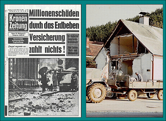 Linke Abb.: Krone-Schlagzeile am Tag nach dem Beben in Seebenstein 1972 © Kronenzeitung; rechte Abb.: Aufräumarbeiten nach dem Beben 1972. Wimpassing im Schwarzatal an der B17 (NÖ). © Josef Wagner