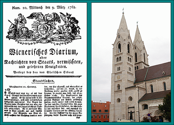 Linke Abb.: Deckblatt des „Wienerischen Diariums”, einem Vorläufer der „Wiener Zeitung”, in welchem am 19. März 1768 über das Beben berichtet wurde. © GeoSphere Austria Hammerl; rechte Abb.: Der Dom in Wiener Neustadt wurde bei diesem Erdbeben schwer beschädigt. © GeoSphere Austria Hammerl