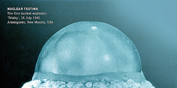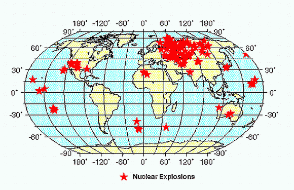 Der erste Kernwaffentest - ´Trinity´ - fand am 16. Juli 1945 in Nevada statt. Damals fiel das Zeiterfassungssystem am Sprengort aus und Gutenberg benutzte Daten der Erdbebenstation TUCSON in Arizona, um den genauen Detonationszeitpunkt des Versuchs festzustellen. Im selben Jahr explodierten über Hiroshima und Nagasaki, Japan, zwei Atombomben. Weltweit wurden im Zeitraum 1945 - 1998 über 2400 Tests durchgeführt. Anzahl der Nuklearwaffentests