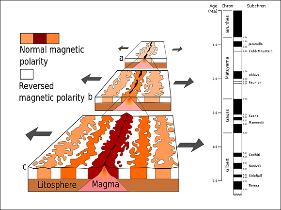 Muster des entgegengesetzt polarisierten Ozeanbodens. a) vor 5 Mio. Jahren, b) vor 2 – 3 Mio. Jahren, c) heute. Durch die Paläomagnetik ist eine geodynamische - tektonische Rekonstruktion der ozeanischen Plattenbewegungen möglich. Die jüngste ozeanische Kruste befindet sich um den Mittel Ozeanischen Rücken und bewegt sich mit der Zeit immer weiter weg vom Mittel Ozeanischen Rücken. Die Ausrichtung der Magnetisierung zum Zeitpunkt beim Abkühlens des Gesteins, behalten die magnetischen Mineralien bei, sofern sie keine Hochtemperaturmetamorphose (über den Curie - Punkt) mehr erfahren. © USGS