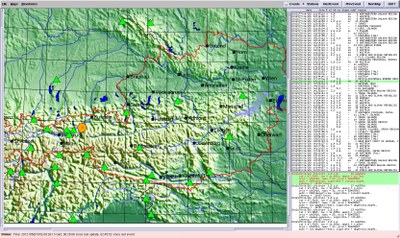 Berechnetes Epizentrum (orangefarbener Kreis) und Lage der Messstationen, die für die Lokalisierung verwendet wurden (grüne Dreiecke) am Beispiel des gefühlten Erdbebens vom 26. Juni 2012 zwischen Fügen und Alpbach in Tirol. Rechts im Bild ist eine Liste mit allen ausgewerteten Erdbeben innerhalb von 72 Stunden (dbevents, Antelope®-Software).
