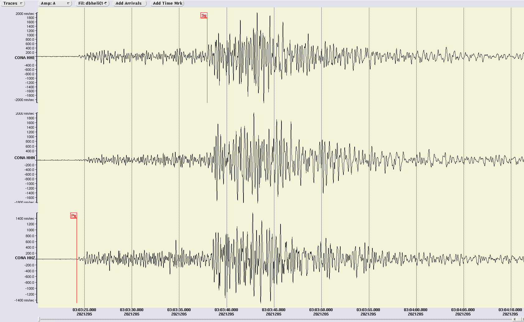 Aufzeichnung eines Erdbebens an den drei Komponenten der Station CONA und Bestimmung der Phasen. Das Erdbeben der Magnitude 2.9 erschütterte am 24. Juli 2021 um 05:03 MESZ Admont.